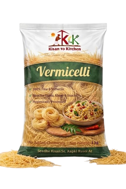 Enjoy the taste of tradition with Kisan to Kitchen Vermicelli (Seviyan), made from premium quality wheat and processed to achieve the perfect thin, uniform texture. Whether you’re preparing a sweet dessert or a savory dish, our vermicelli delivers great taste, quick cooking, and consistent quality every time.