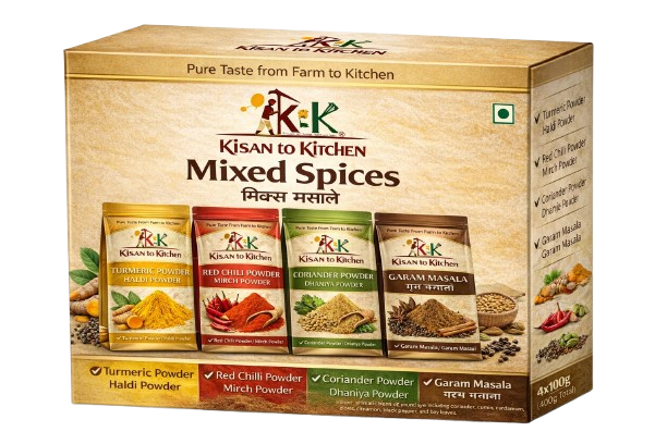 Add authentic flavor and aroma to your dishes with the Kisan to Kitchen Mixed Spices Combo Pack, a perfect blend of essential Indian spices crafted for every kitchen. This combo includes Turmeric Powder, Red Chilli Powder, Coriander Powder, and Garam Masala, carefully sourced and processed to retain their natural color, aroma, and taste.